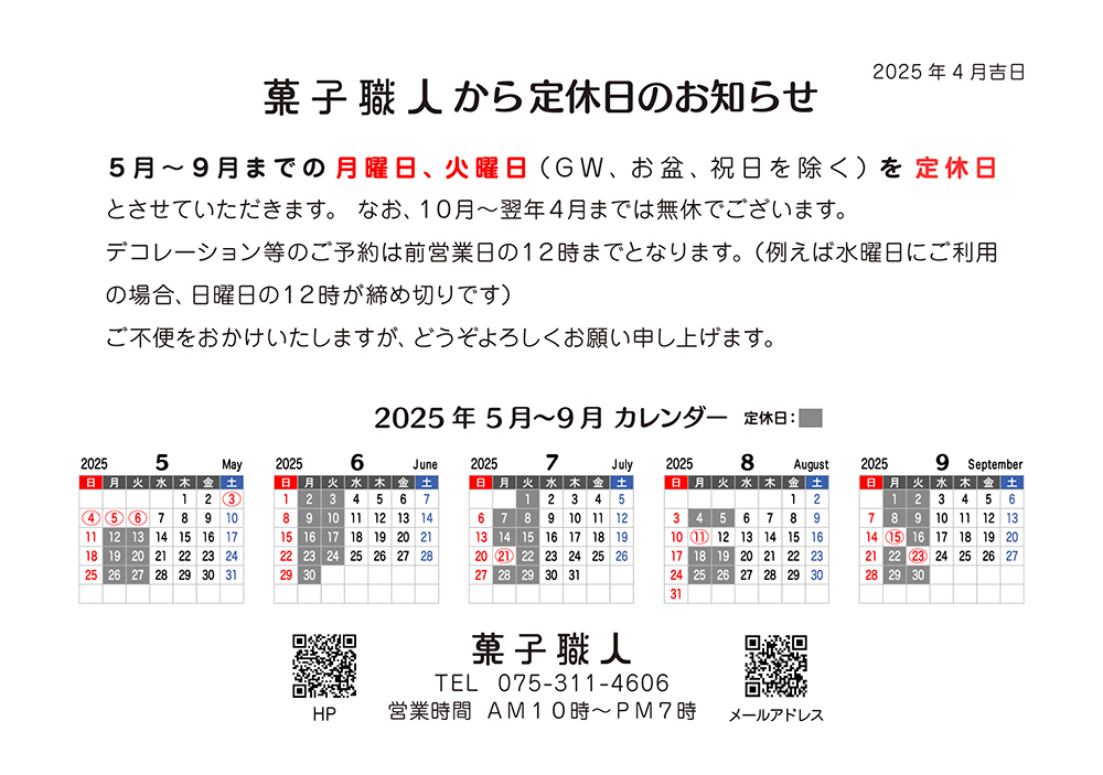 また、5月~9月まで月曜日、火曜日(GW、お盆、祝日を除く)を定休日とさせていただきます。